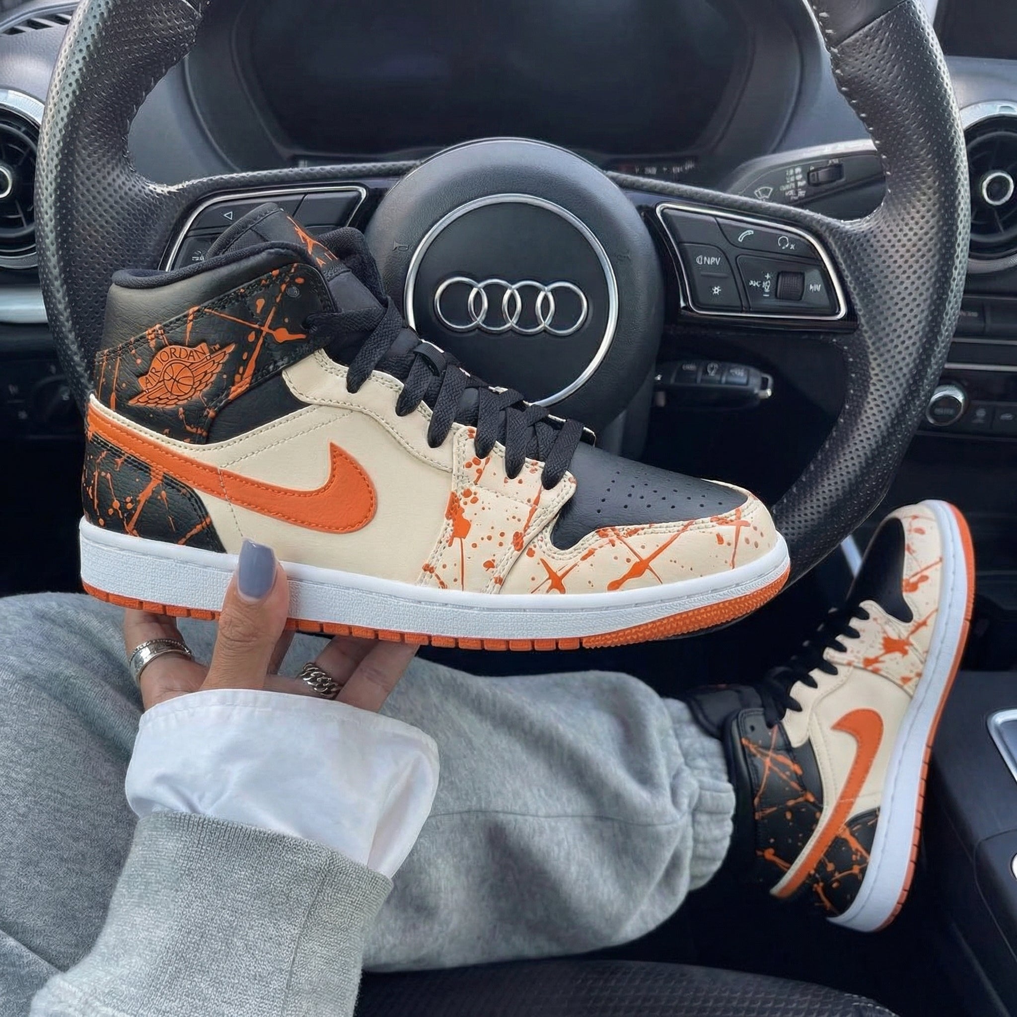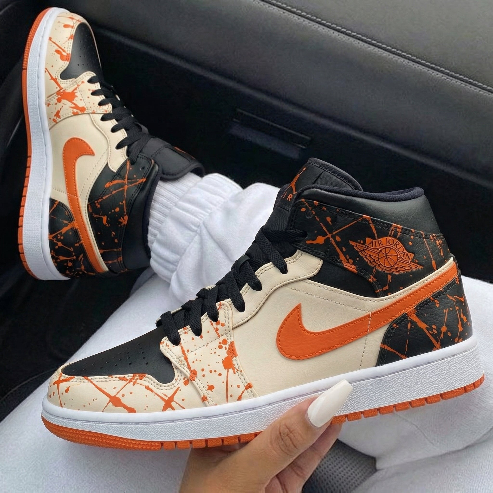 Step up your sneaker game with these one - of - a - kind Custom AJ1s. The striking black and orange splatter design is a head - turner, making these sneakers a bold statement piece for any outfit. Whether you're hitting the streets or hanging out with friends, these kicks will ensure you stand out from the crowd.
