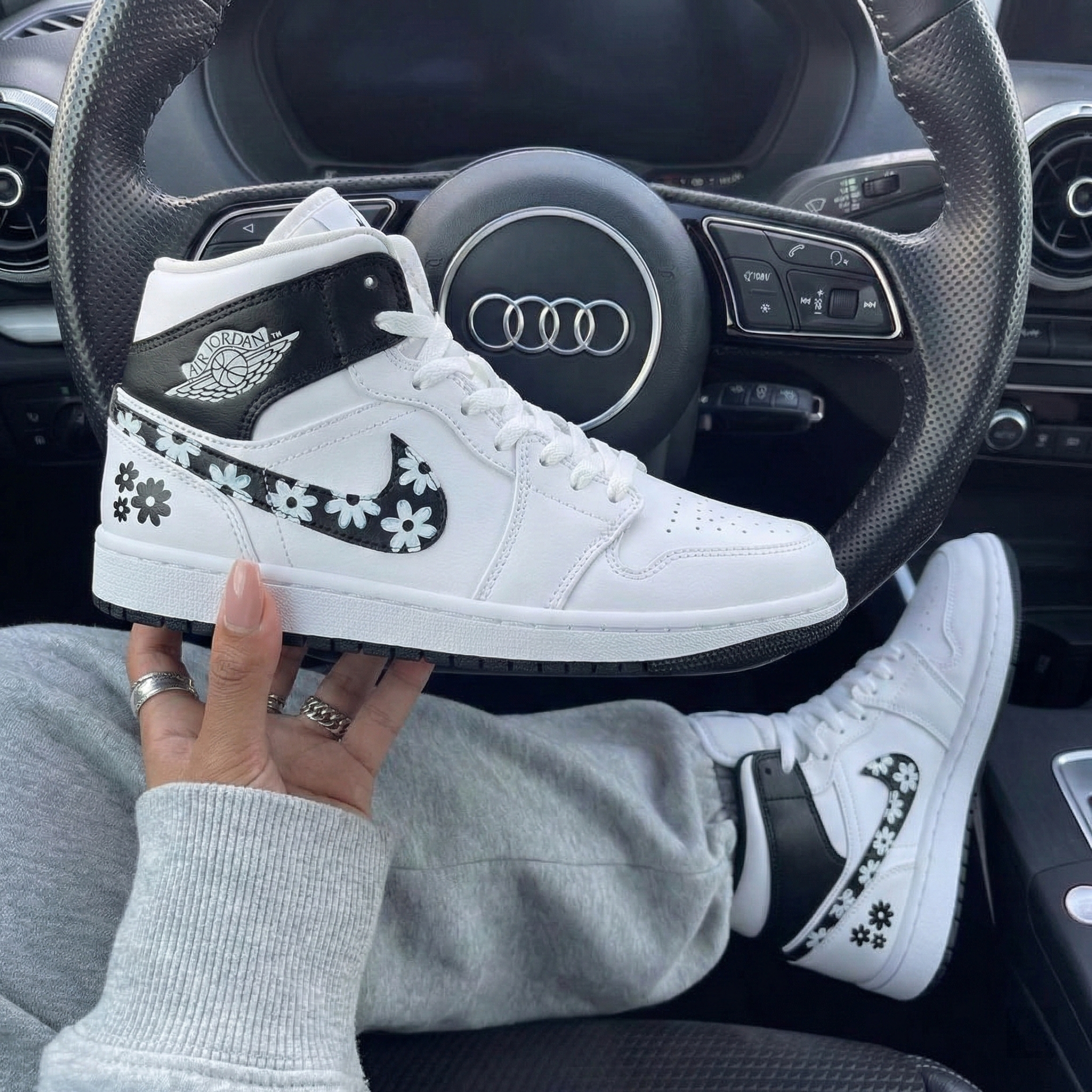 Step up your sneaker game with these one - of - a - kind Custom AJ1s. The Black White Daisy design is a fresh take on the classic Air Jordan 1 silhouette. The black and white daisy patterns on the swoosh and sides add a touch of floral charm to the iconic high - top. Crafted with care, these Custom Sneakers are not just shoes; they are a statement piece. Whether you're hitting the streets or showing off on social media, these Custom shoes will turn heads. Made for those who want to stand out in style.