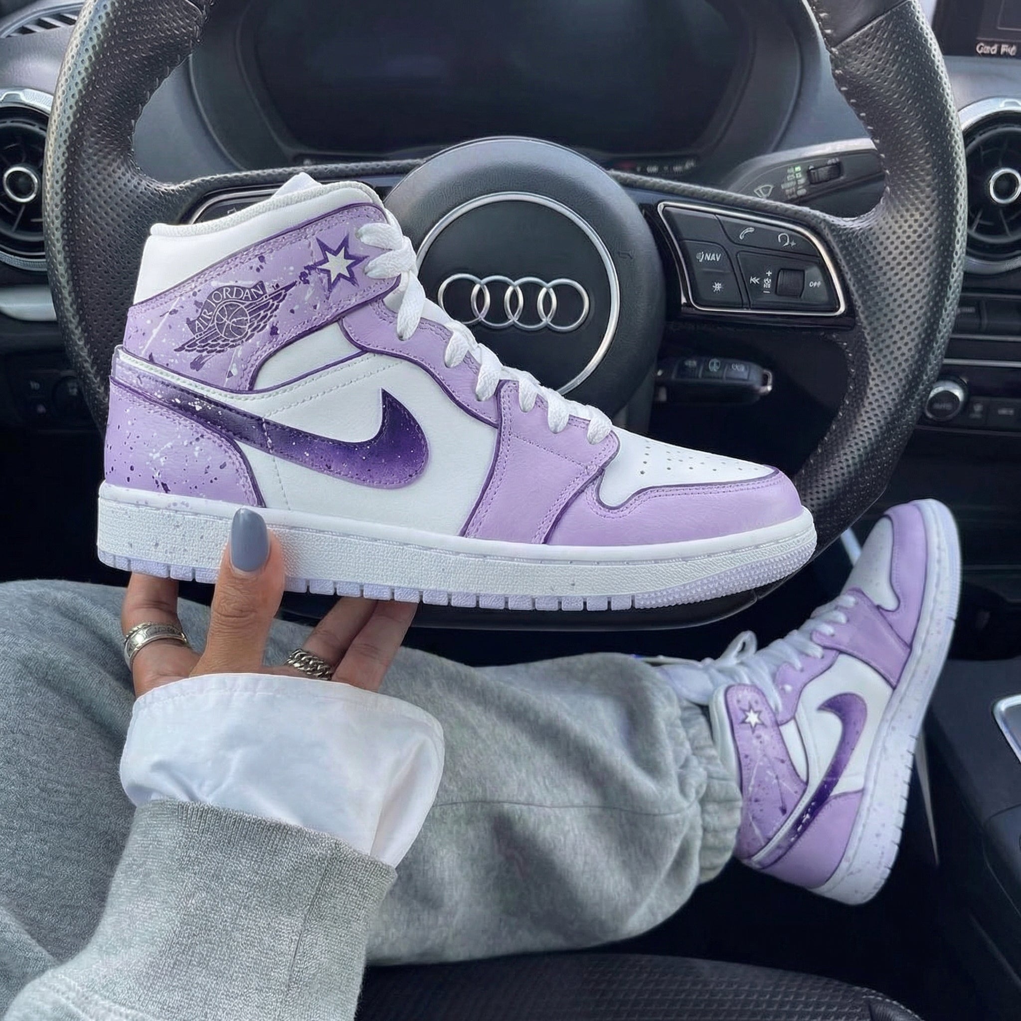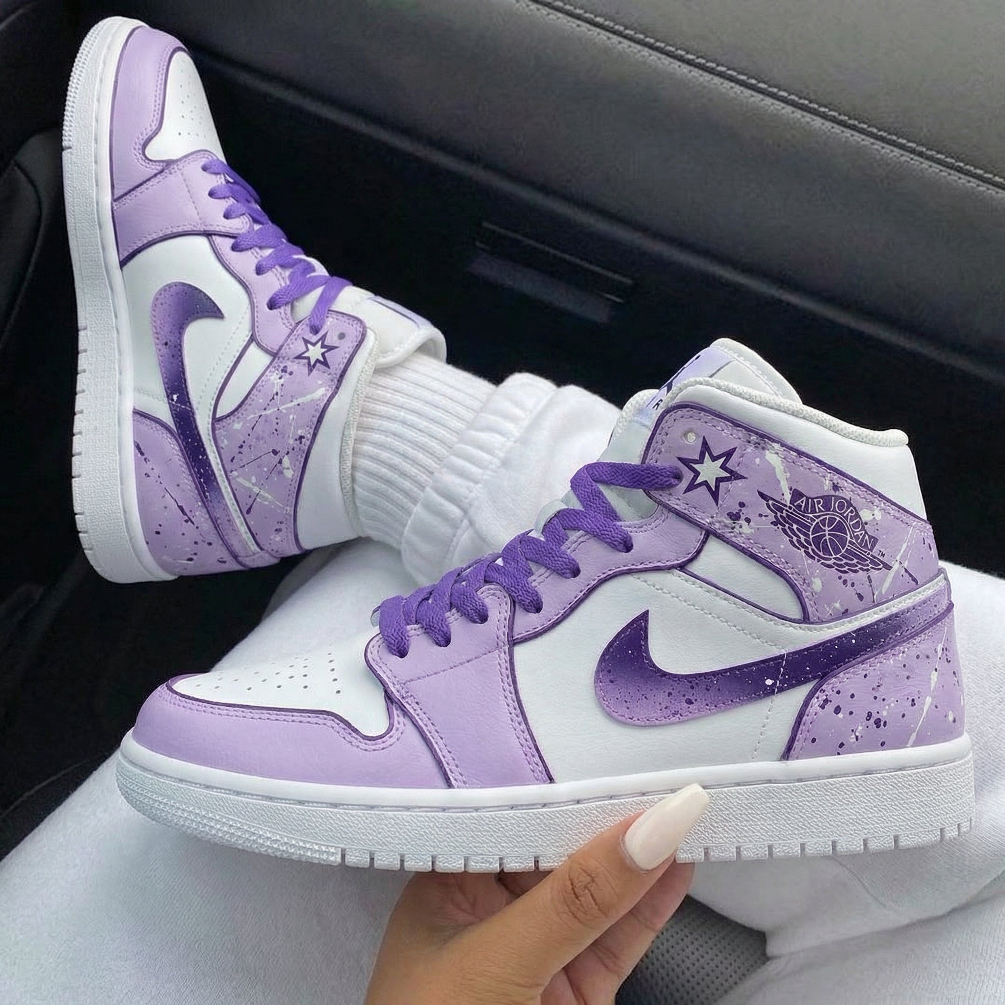 Step up your sneaker game with our Lavender Star - Splatter Custom AJ1. These custom sneakers are a true work of art, featuring a dreamy lavender colorway with splatter details and star accents. The white base provides a clean contrast, making these shoes a standout addition to any collection. Each pair of our Custom AJ1s is meticulously hand - painted by skilled artists, ensuring a unique and high - quality finish. Whether you're a sneakerhead or just looking for a one - of - a - kind pair of shoes, these custom shoes are sure to turn heads and spark conversations.