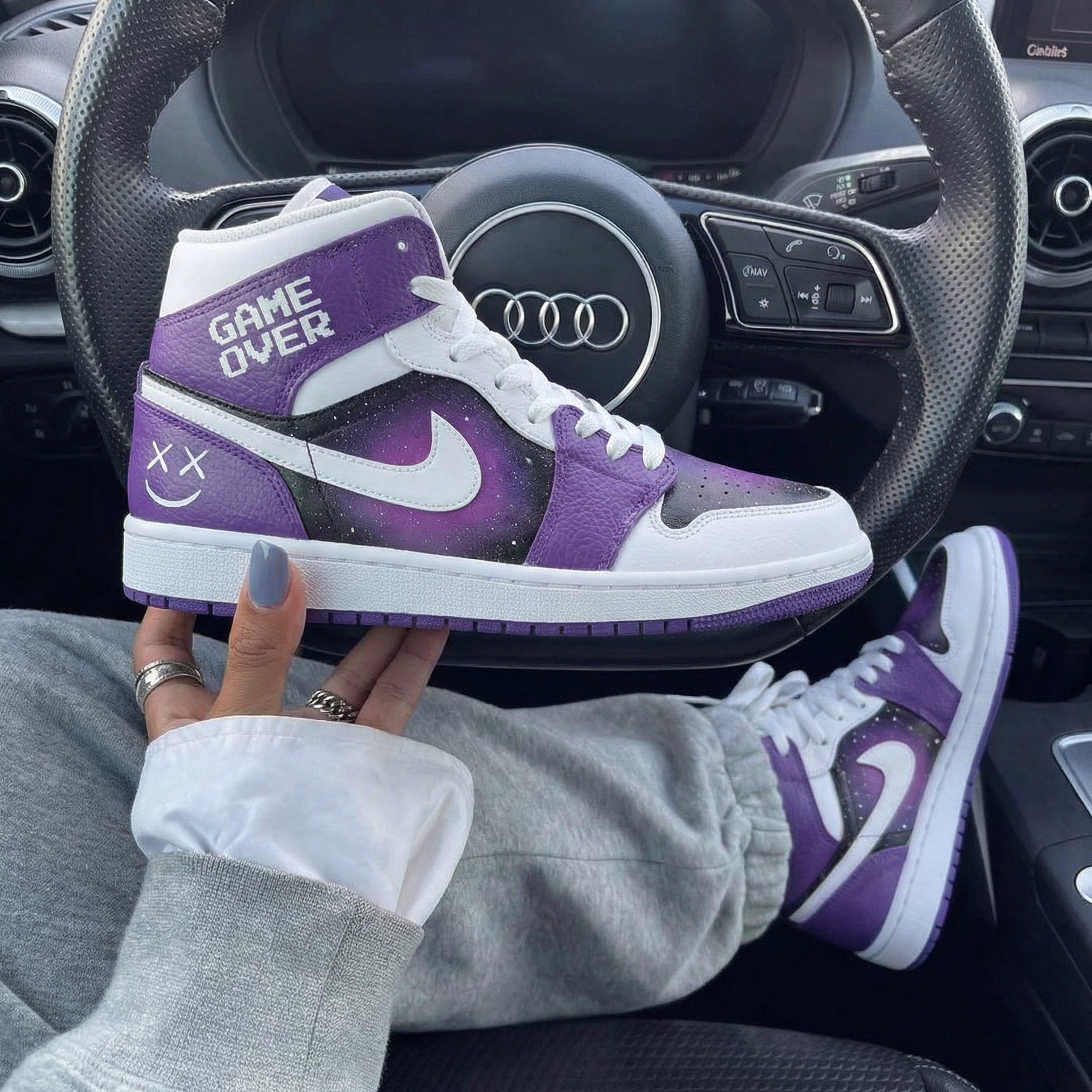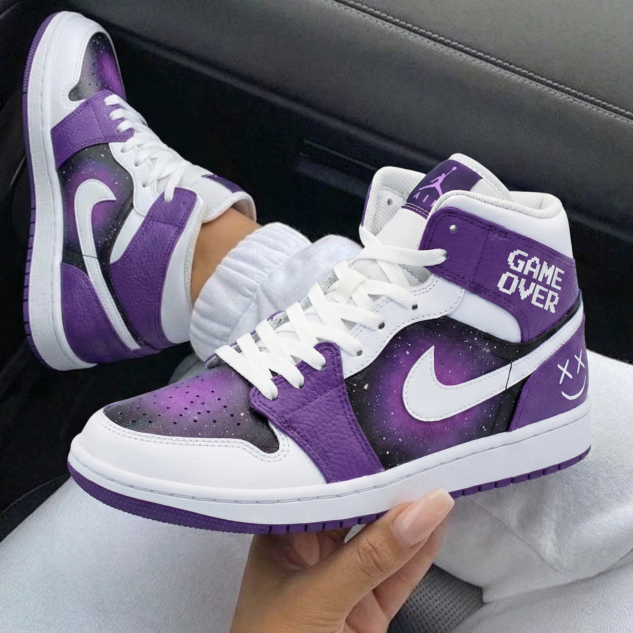 Step up your sneaker game with these one - of - a - kind Custom AJ1s. Inspired by a purple galaxy and featuring the iconic "GAME OVER" text, these sneakers are a true statement piece. The combination of the cosmic purple hues with the classic AJ1 design creates a look that's both edgy and stylish.