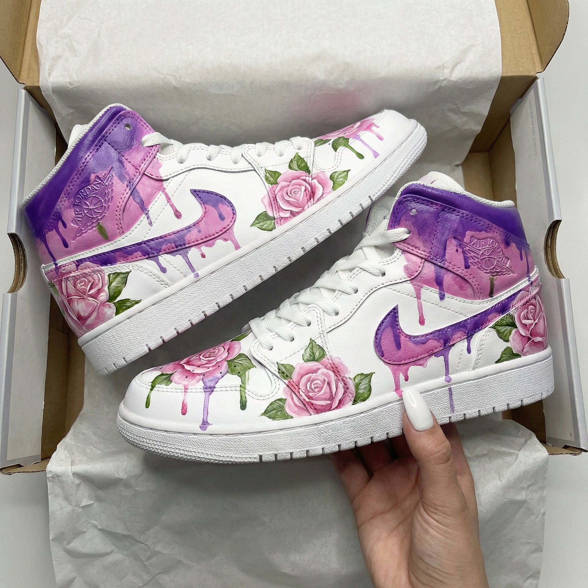 Elevate your sneaker game with these one - of - a - kind Custom AJ1s. Featuring a stunning design of purple and pink roses, they blend art and style seamlessly. The dripping effect adds a touch of edginess, making these Custom Sneakers a true statement piece.