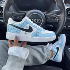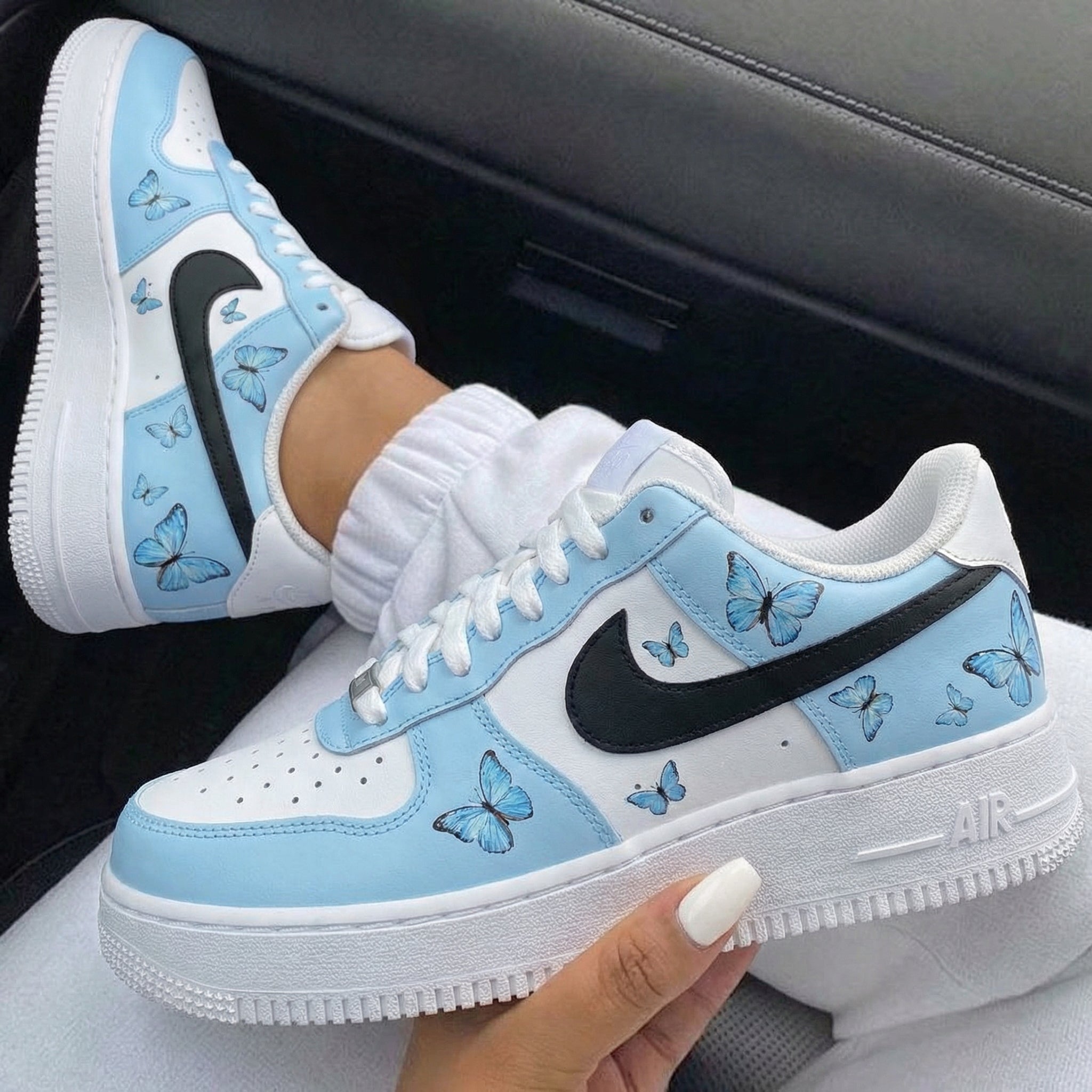 Step into style with these one - of - a - kind Custom AF1 sneakers. The soft baby blue hue, combined with white and a striking black Nike swoosh, creates a visually appealing base. Adorned with delicate blue butterflies, these shoes are a true work of art, making them a standout addition to any sneaker collection. Not only do these Custom shoes offer a unique and eye - catching design, but they also provide the comfort and quality that Air Force 1s are known for. Whether you're hitting the streets or just looking to make a fashion statement, these Custom Sneakers are the perfect choice.