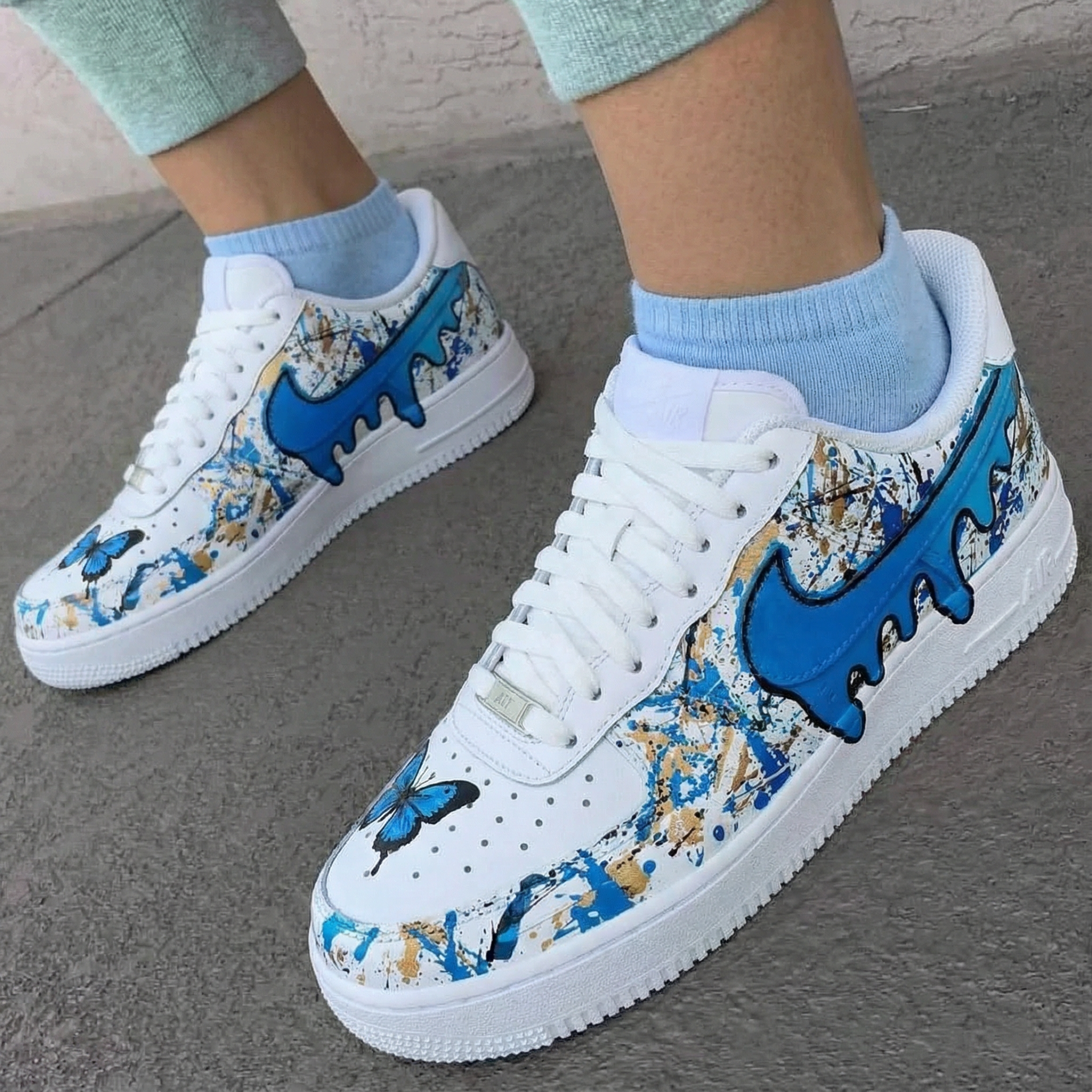 Step up your sneaker game with these one - of - a - kind Custom AF1s. The "Blue Drip Butterfly" design features a striking blue drip - effect logo and a beautiful butterfly, all set against a clean white backdrop. The splashes of blue and gold add an edgy, artistic touch.
