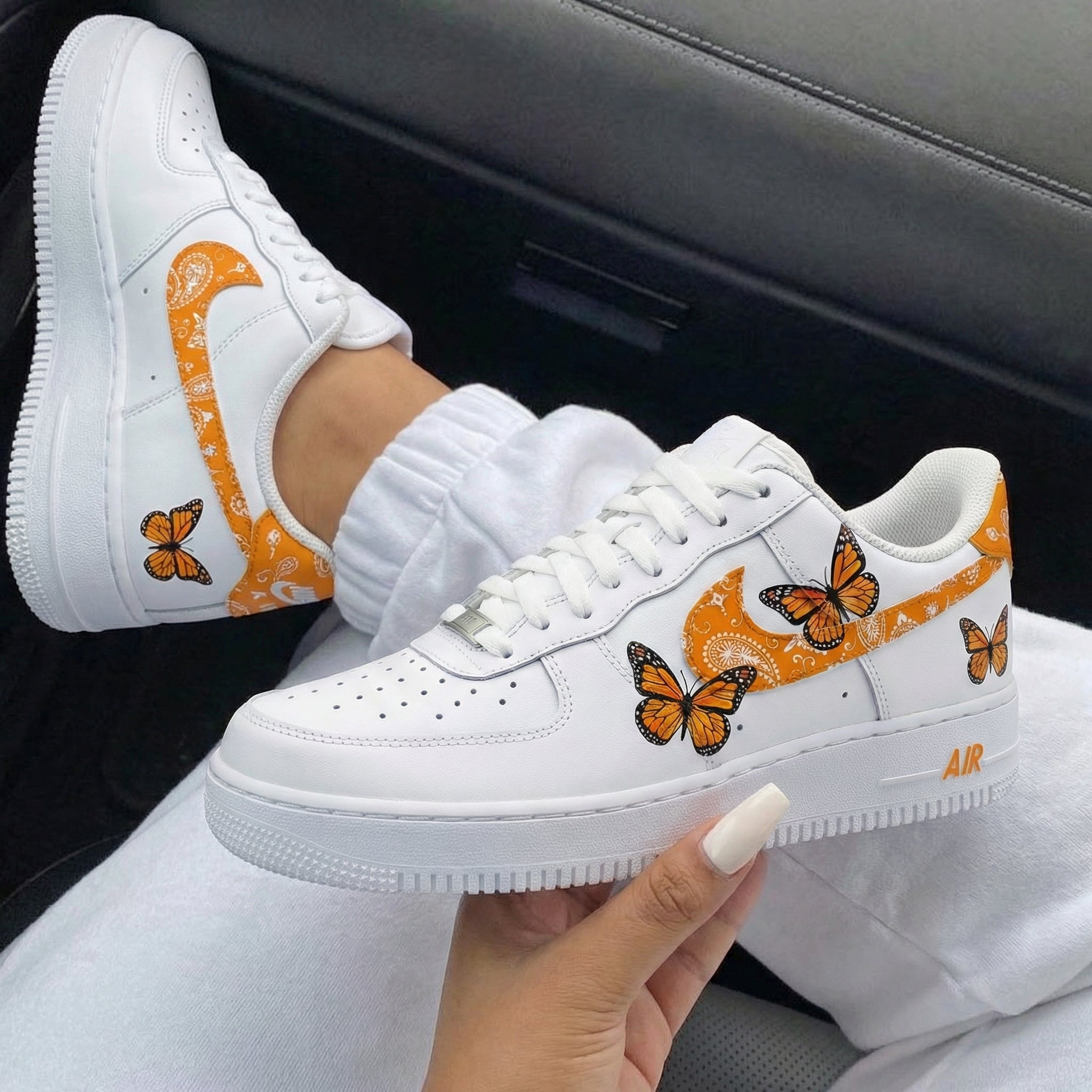 Step up your sneaker game with these one - of - a - kind Custom AF1s. The classic Air Force 1 silhouette gets a vibrant makeover with eye - catching orange paisley accents on the swoosh and heel. Paired with delicate butterfly designs, these custom shoes are a perfect blend of style and individuality.