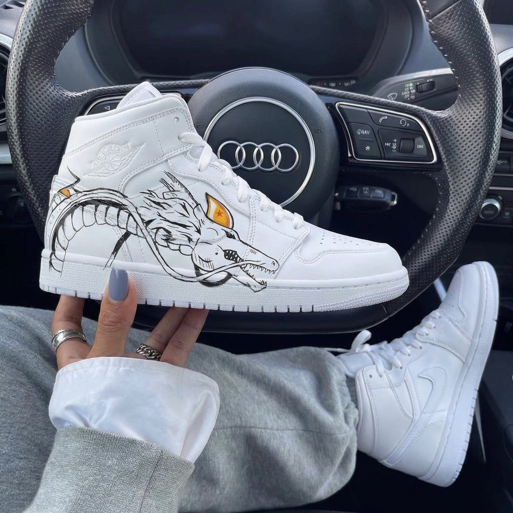 The clean white leather base acts as a muted canvas for sharp black Shenron line art, with a vivid orange eye adding a precise, eye-catching contrast without disrupting the shoe’s refined, restrained aesthetic.
