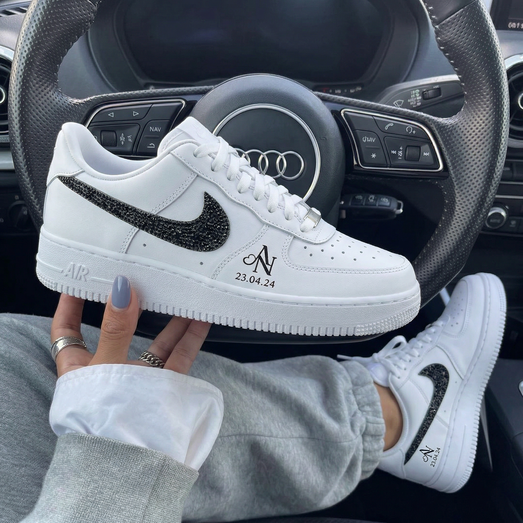 These Custom AF1, Custom shoes and Custom Sneakers bring polished versatility to modern street style, merging the iconic AF1 silhouette with understated, on-trend edge that elevates curated casual and urban ensembles. A crisp white leather base anchors the design, paired with a black rhinestone-embellished Swoosh and subtle custom monogram date marking. The restrained tonal contrast leans into quiet luxury, highlighting artisanal detail without overstatement.